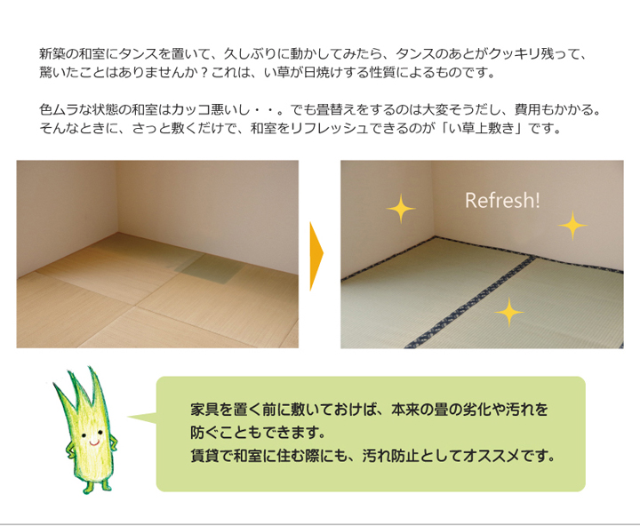 | ■上敷きを敷くだけで畳のお部屋をリフレッシュ出来ます。 ■日焼けしてしまった畳のリフレッシュに、新品の畳を汚さないためのカバーにご使用下さい。 ■長さ115〜120cm程の国産(九州産)い草を使用しています。そのうち約95cmを使用しています。 ■ヘリ際は強く白みを帯びます。(日焼けではありません、い草の根元と先端部分の色です。)い草は長いものほど高級になります。い草は先端部分が赤茶色く、根元が白く真中が青(緑)色です。真中の良質な青の部分を多く使用するほど、丈夫で綺麗な仕上がりとなります。またイ草は使用するうちに日焼けをしますが、真中の青の部分を多く使用したものほど、全体が綺麗にムラなく日焼けし、味が出ます。 ■こちらの商品は畳表と同じ織り方の糸引織で仕上げました。双目織りと比べて、い草の打ち込み本数が多いため丈夫です。表面が滑らかなので、ホコリなどがたまりにくいのが特徴です。長くご使用されたい方や、耐久性をお求めの方には糸引織をおすすめします。 ■国産(九州産)のい草を使用しています。国産い草は一本一本が太く、表皮が厚く繊維がキメ細かいので弾力性があり、耐久性に優れています。 ■い草には空気の清浄化作用、湿度の調節作用があり、汚れにくいといった特徴があります。 ■い草に青森ヒバ加工を施しています。(抗菌、防臭効果) ■表裏の両面が使えて経済的です。 ※写真は表記サイズと異なる場合がございます。 |