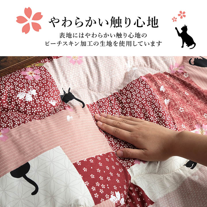 | ■ 和のテイストにかわいらしいネコ柄をデザインしたこたつ布団。 ■ 中綿をたっぷり使用して、ふっくら仕上げました。 ■ 表地にはやわらかい触り心地のピーチスキン加工の生地を使用しています。 |