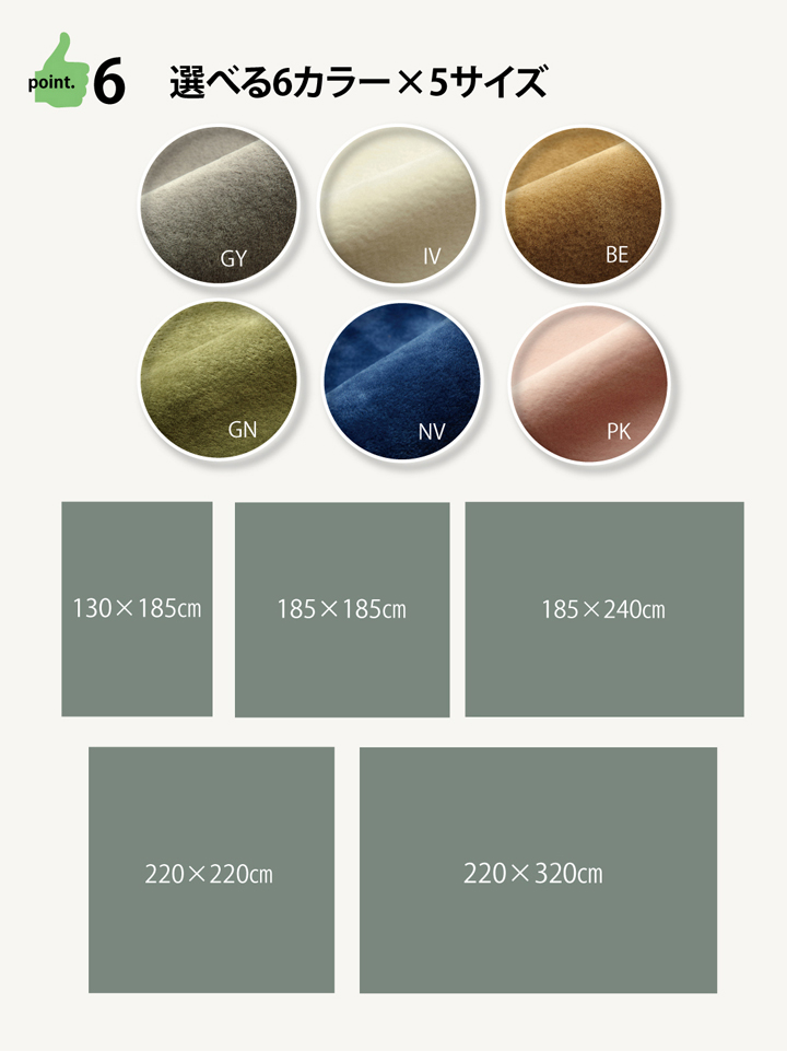 | ■いままでのラグのご不満を解消すべくつくった、使いやすさにこだわったラグです。 ■多色展開ですのでお部屋に合わせてお好きな色をお選び下さい。 ■ラグの不満を解消できる10個のポイント @ソフトな肌触り。表地には短毛のマイクロファイバー(超極細繊維)を使用していますので、ソフトな肌触りです。 Aヘタリにくい。目付は1平方メートルあたり240gで、密度が高くヘタリにくい仕様です。 Bオールシーズン使える。ホットカーペット、床暖房対応です。サラリとしていますので、べとつかず暑い時期にもご使用頂けます。 Cホコリが取れやすい。毛足が短いので掃除機もかけやすく、毛足にゴミが絡みにくい。マクロファーバーは遊び毛がでにくいという特長も持っています。 Dつまづきにくい。厚み約4〜5mmで段差が少ないのでお子様やお年寄りにも安心です。 Eすべりにくい。普段見えない裏部分にもこだわりました。フローリングを傷つけにくいよう裏には不織布を貼っています。また、すべりにくい加工を施していますので、部屋を走り回るのが大好きなお子様やペットがいるご家庭にも安心てご使用頂けます。 F軽量で持ち運び楽々。 G洗濯機で洗える(洗濯ネット使用)。ご家庭の洗濯機で洗えるウォッシャブル仕様です。軽量なので干しやすいです。 Hインテリア性へのこだわり。ヘリ部分はヘムをまかずにオーバーロック加工で仕上げました。お部屋に敷いて頂いた際の見た目にもこだわりました。 Iコンパクト収納。薄手なので小さく折りたたむことができます。収納時にも場所をとりません。 ※写真は表記サイズと異なる場合がございます。 |