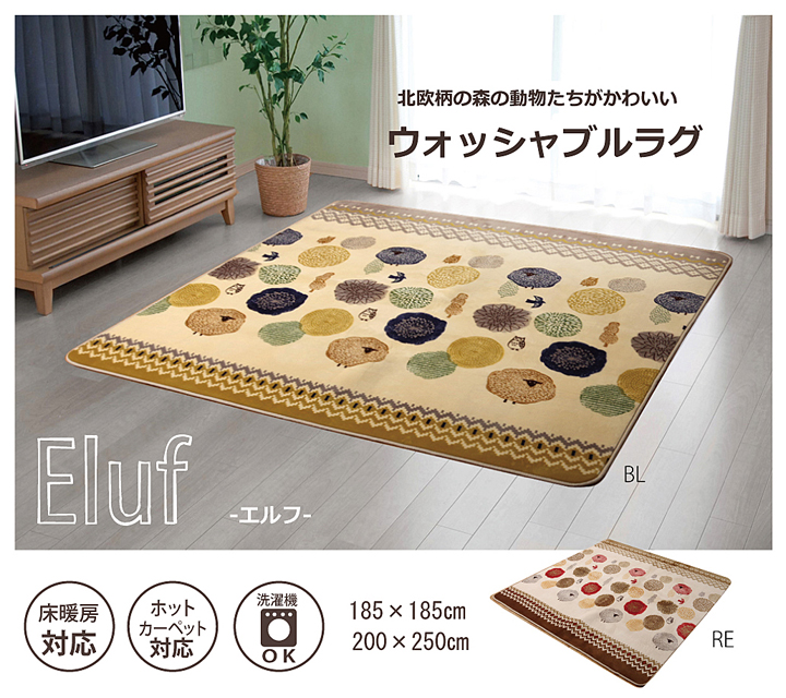 | なめらかタッチ 北欧柄 洗える ラグ 『エルフ』 約185×185cm |