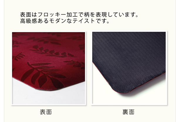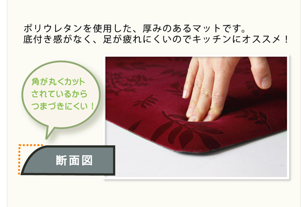 | ■ポリウレタンを使用したふかふかとしたマットです。ボリュームのある厚さ(約15mm)で底付き感を感じにくい仕様です。表地にはフロッキープリントを施し上品に仕上げました。丸くカットした角はつまづきにくく、めくれにくくなっています。玄関、キッチンいろいろな場所でご使用いただける商品です。 ※写真は表記サイズと異なる場合がございます。 |