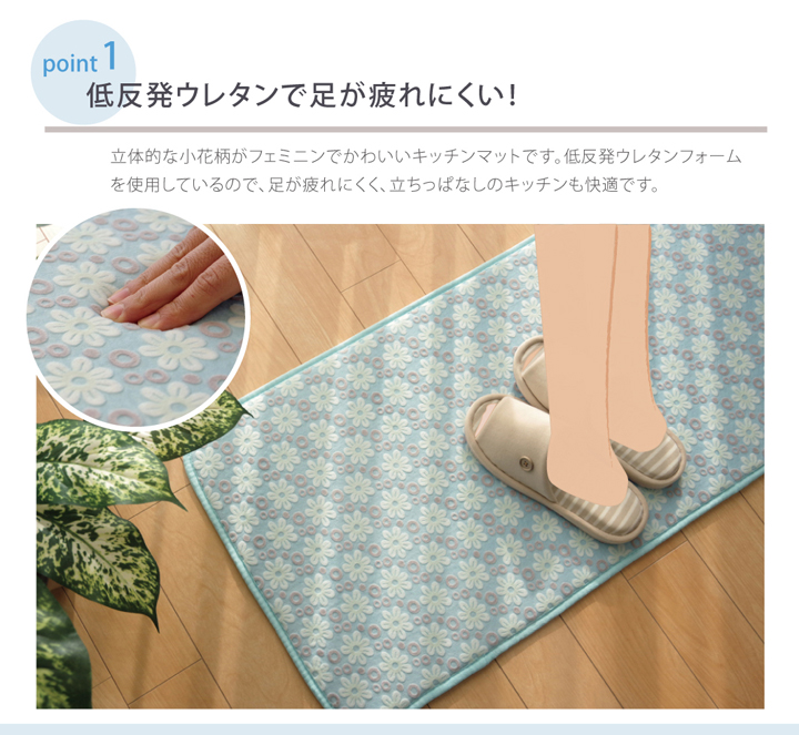 | ■かわいらしい花柄をプリントしたキッチンマットです。表地にはふわっとやわらかな肌触りのフランネルを使用しています。 ■中材には低反発ウレタンフォームを使用しているため足が疲れにくい商品です。 ■裏面にはすべりにくい加工を施しています。 ※写真は表記サイズと異なる場合がございます。 |