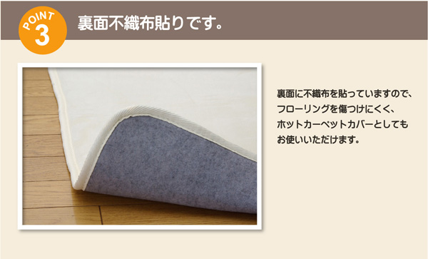 | ■表地にフランネル糸と呼ばれる繊維を使用し、なめらかなでしっとりとした肌触りに仕上げました。又表地には撥水加工を施しており、万が一水などをこぼしても表面張力で水玉状に汚れをはじき、染み込みにくいのでお手入れが簡単です。中材にはウレタンを5mm使用しており適度なクッション性があります。裏地にはフローリングを傷付けにくい不織布を貼っています。秋冬シーズンにはホットカーペットカバーとしてもご使用頂けます。 ■お洗濯は30℃以下の水温で弱い手洗いができます。中性洗剤を使用して下さい。 ■乾燥は日陰の吊り干しが良い。 ※写真は表記サイズと異なる場合がございます。 |