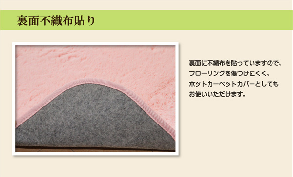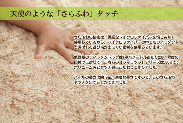 | ■カラーは選べる10色展開です。表地にフィラメント糸(極めて長い繊維)を使用しています。遊び毛が出にくく、耐久性に優れています。パイルの長さは約18mmと適度な長さで、しっとりふわふわとしたやさしいタッチ感を出しました。フローリングを傷つけにくいよう、裏には不織布を貼っています。 ■お洗濯は30℃以下の水温で弱い手洗いができます。中性洗剤を使用して下さい。 ■乾燥は日陰の吊り干しが良い。 ※写真は表記サイズと異なる場合がございます。 |