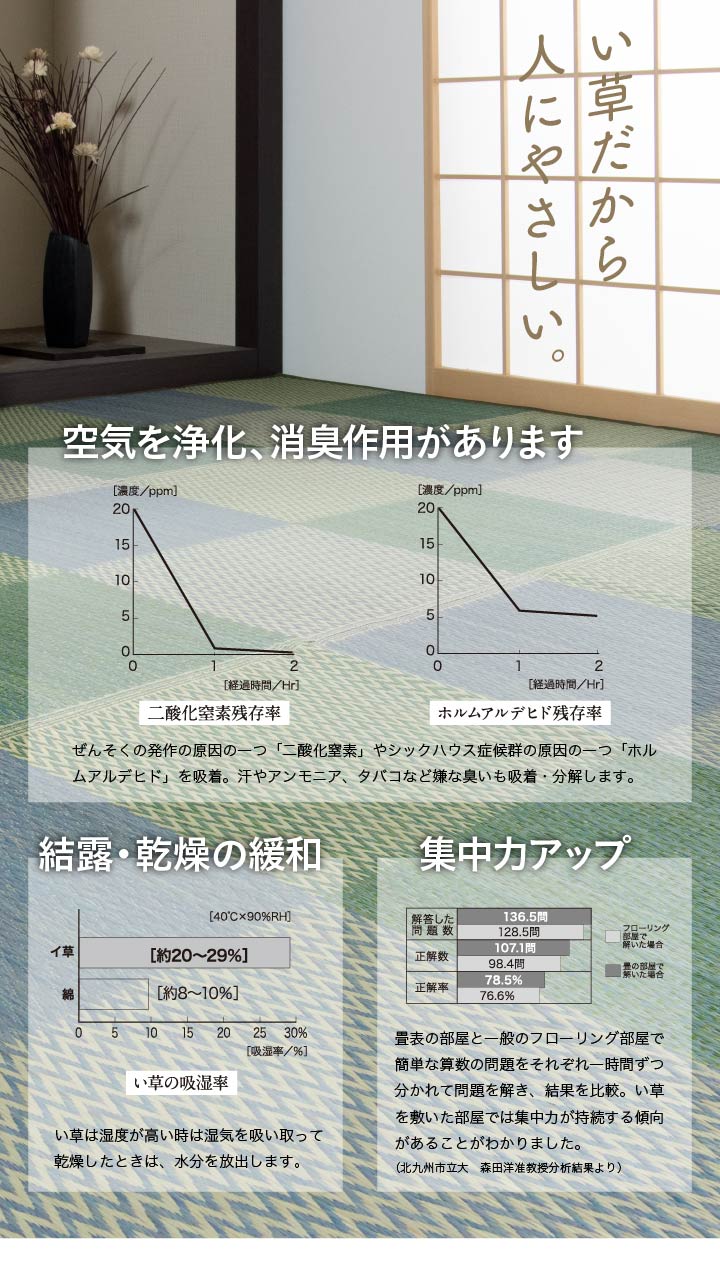 ■ い草には空気の清浄作用、湿度の調整作用があり、汚れにくいといった特徴があります。敷くだけで畳のお部屋をリフレッシュできます。<br>