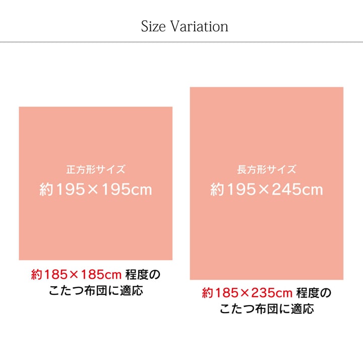 | 適応こたつ布団サイズ | 185×185cm程度のこたつ掛け布団に適応 |
