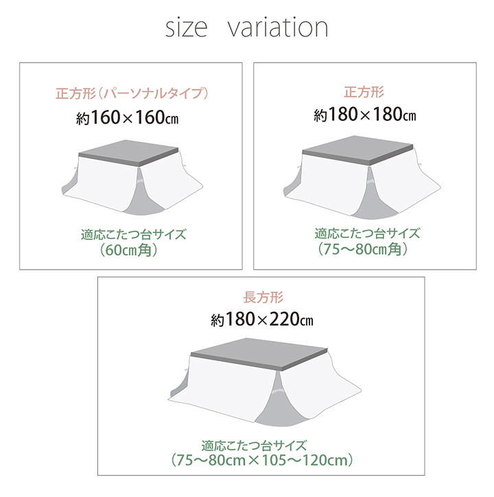 | 【適応こたつ台サイズ】 75〜80cm角のこたつ台に適応 | |