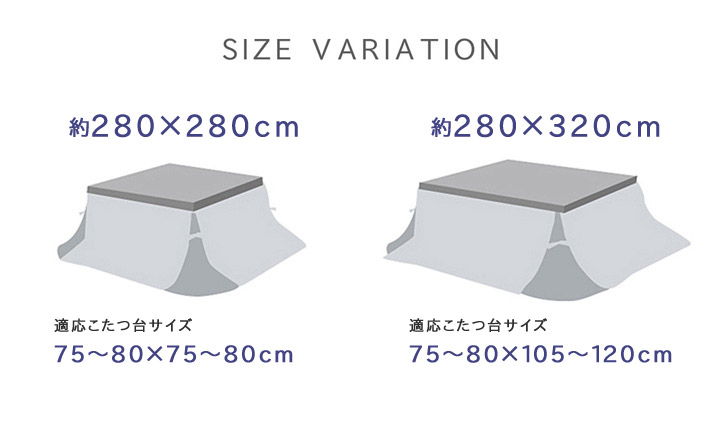 | サイズ | 約280×280cm (75~80cm角のこたつ台に適応) |