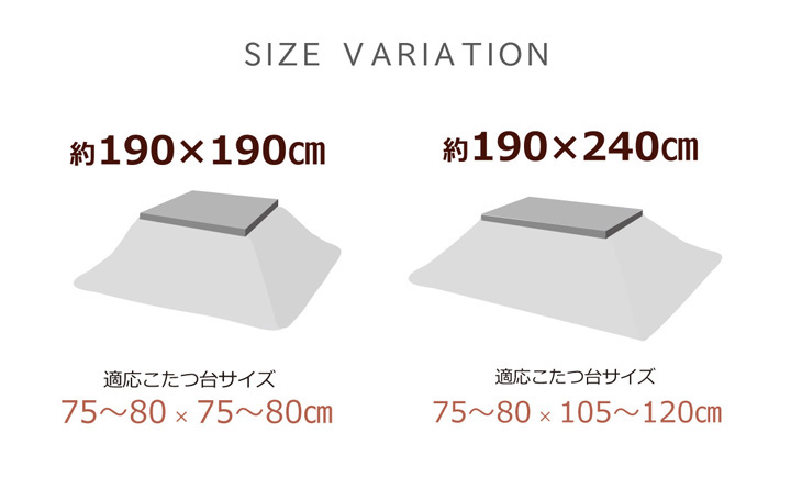 | サイズ | 約190×240cm (75~80cm×105~120のこたつ台に適応) |