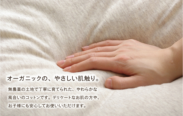 | ■側地素材にオーガニックコットンを使用。無農薬の畑で丁寧に育てられた、人と環境にやさしいコットンです。その自然な風合いは気持ちよく、肌にもとびきりの優しさです。デリケートなお肌の方やお子様にも安心です。綿の産地、インド産の綿を使用しています。綿はポリエステルに比べ、静電気が起きにくく、繊維の中でも特に肌触りがよいのが特徴です。季節を選ばずオールシーズンご使用頂けます。ご家庭の洗濯機で洗えるので、清潔にご使用頂けます。 ※写真は表記サイズと異なる場合がございます。 |