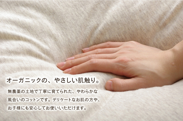 | ■側地素材にオーガニックコットンを使用。無農薬の畑で丁寧に育てられた、人と環境にやさしいコットンです。その自然な風合いは気持ちよく、肌にもとびきりの優しさです。デリケートなお肌の方やお子様にも安心です。綿の産地、インド産の綿を使用しています。綿はポリエステルに比べ、静電気が起きにくく、繊維の中でも特に肌触りがよいのが特徴です。季節を選ばずオールシーズンご使用頂けます。ご家庭の洗濯機で洗えるので、清潔にご使用頂けます。 ※写真は表記サイズと異なる場合がございます。 |