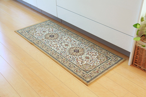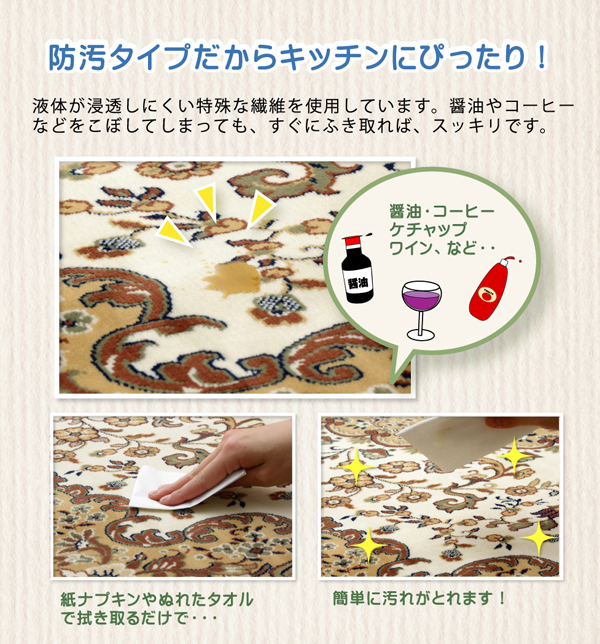 | ■お醤油などをこぼしてもすぐに拭き取ればシミになりにくい防汚タイプのキッチンマットです。液体が浸透しにくい特殊な繊維を使用しているため、汚れにくくお手入れも簡単です。ドイツで織り上げられた繊細な模様は上品に演出してくれます。裏面には、滑りにくい加工を施しています。 ※写真は表記サイズと異なる場合がございます。 |