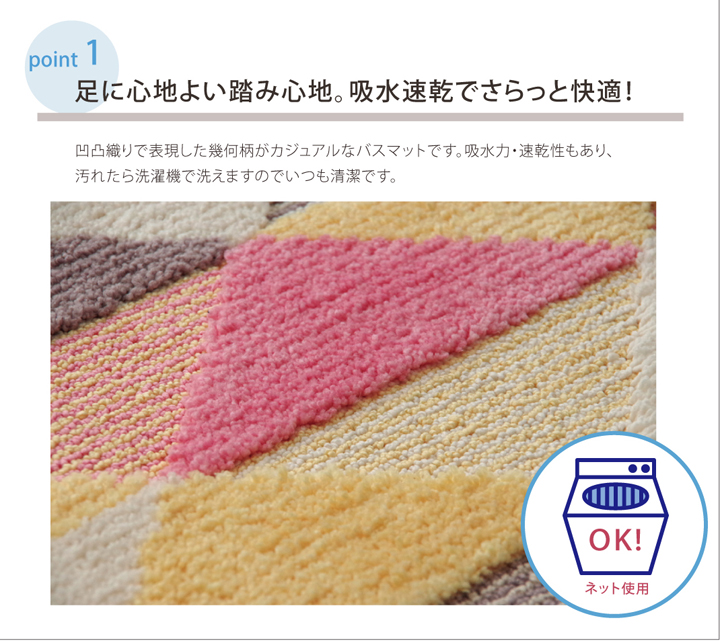 | ■カラフルなカラーのバスマットです。吸水性に優れた商品です。 ■織り方で凹凸感をつけました。さらっとしたやわらかな肌触りの商品です。裏面には滑りにくい加工を施しています。 ■ご家庭の洗濯機で洗えますので、お手入れも簡単です。(洗濯の際はネットをご使用ください) ※写真は表記サイズと異なる場合がございます。 |