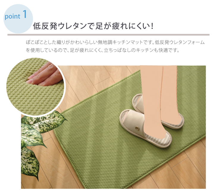 | ■無地のシンプルなキッチンマットです。 ■中材には低反発ウレタンフォームを使用しています。立ちっぱなしのキッチンでも足が疲れにくいように工夫しました。 ■裏面には滑りにくい加工を施しており、シンプルな色味はキッチンの雰囲気を崩さずにご使用いただけます。 ※写真は表記サイズと異なる場合がございます。 |