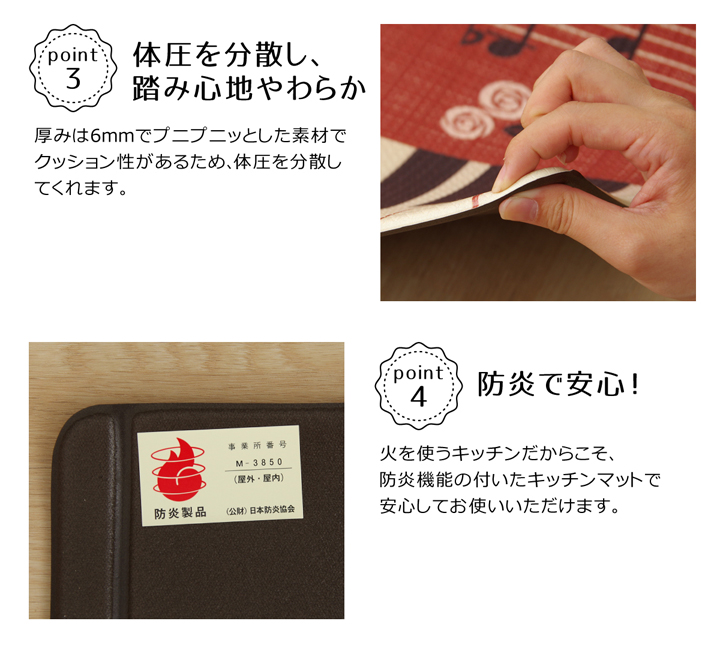 | ■キッチンとマットの隙間にゴミが溜まるという、キッチンの不満を解消する商品です。 マットの上から2cm部分に折り目の線が入っており、キッチンと床の直角に敷くことができ、ゴミが溜まりません。 ■吸着材質を使用しているのでずれにくいです。 ■厚みは6mmでクッション性があり、さっとひと拭きでお手入れが簡単です。 ■抗菌防臭・防炎・吸着機能付き。 |