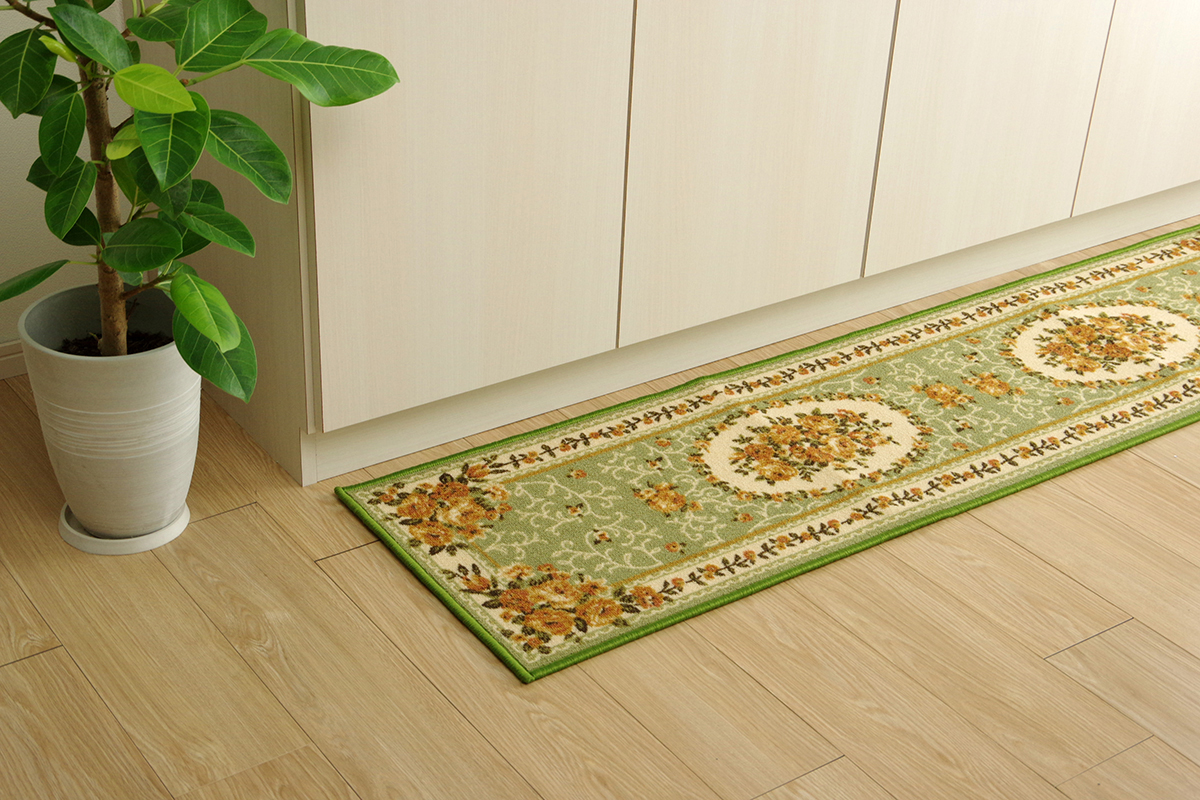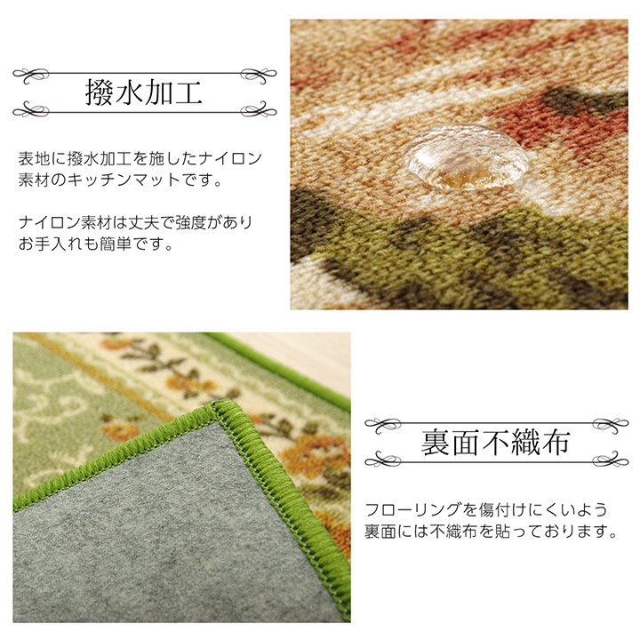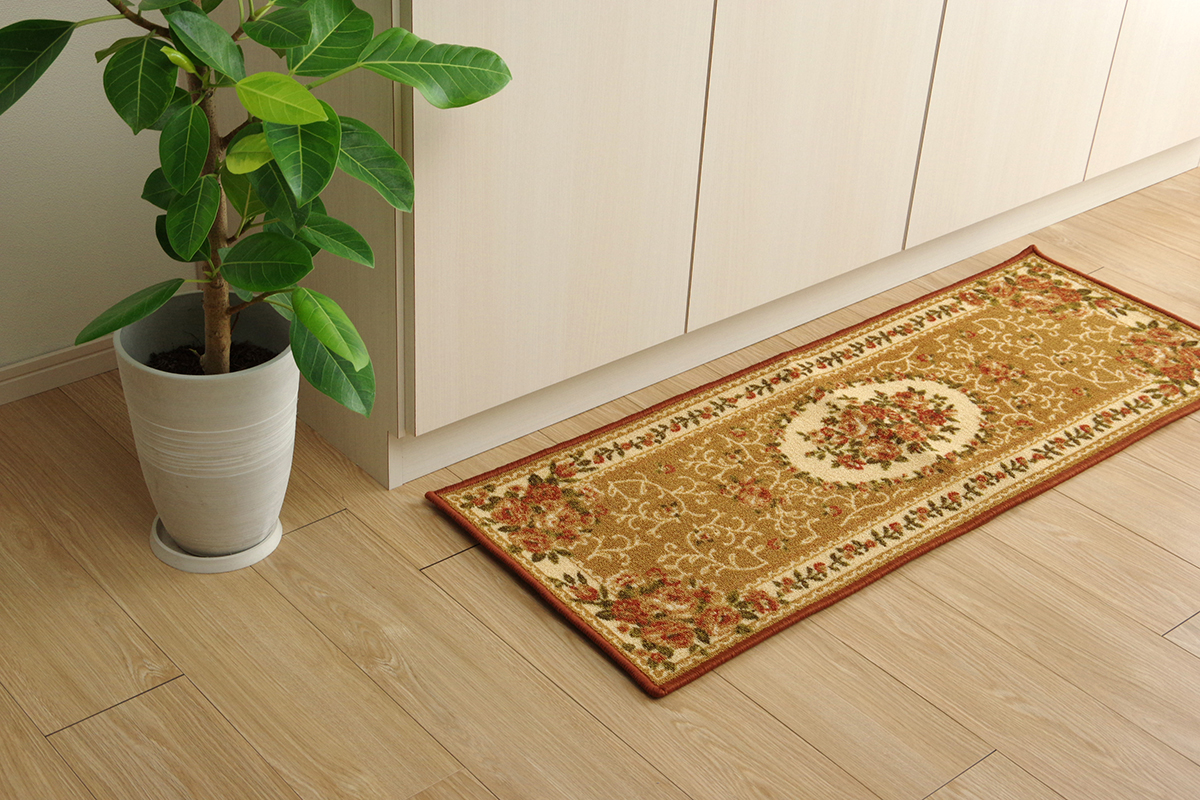 ■エレガントな撥水キッチンマットです。 ■表地には撥水加工を施しておりますので、汚れにくくお手入れも簡単です。 ■表地のパイル部分にはナイロンを使用しています。ナイロンは強度や摩耗に強く、速乾性があり、また遊び毛も出にくいなどの特徴があります。 ■同柄のラグサイズ・敷き詰めサイズも取扱いがありますので、トータルでのコーディネートもお勧めです。 ■フローリングを傷つけにくいよう、裏には不織布を貼っております。 ※ 掲載写真は表記サイズと異なる場合がございます。 ※ 画面上のカラーはご使用ブラウザやモニターの設定により、実物とは若干異なる場合がございます。あらかじめご了承の上、ご注文をお願いいたします。 |