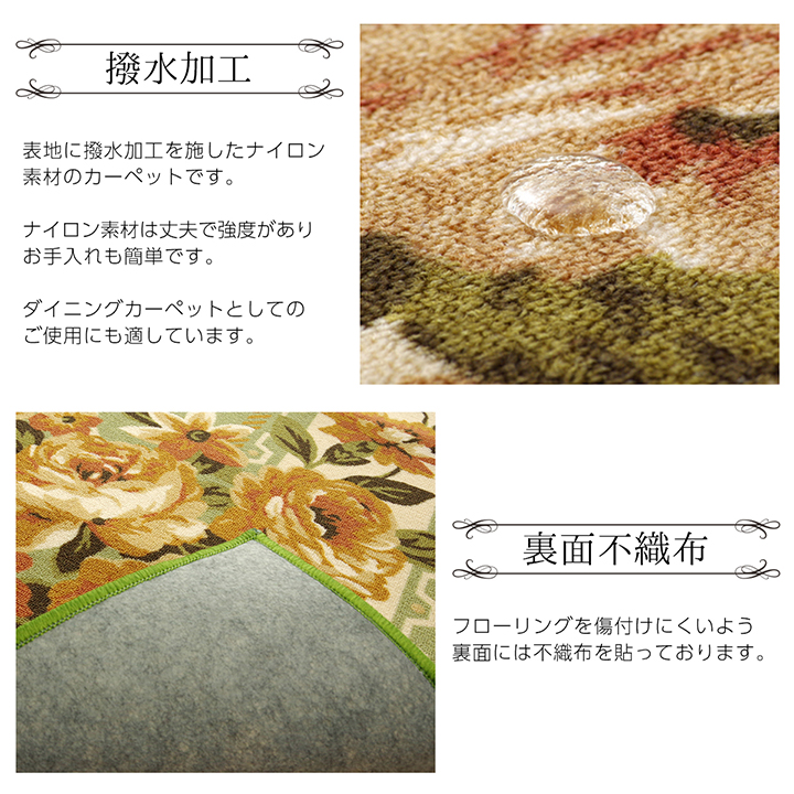 ■エレガントな撥水カーペットです。 ■表地には撥水加工を施しておりますので、汚れにくくお手入れも簡単です。 ■表地のパイル部分にはナイロンを使用しています。ナイロンは強度や摩耗に強く、速乾性があり、また遊び毛も出にくいなどの特徴があります。 ■ダイニングカーペットや敷き詰めカーペットとしてのご使用にも適しています。 ■季節を選ばず、オールシーズンご使用頂けます。 ■同柄のキッチンマットも取扱いがありますので、トータルでのコーディネートもお勧めです。 ※ 掲載写真は表記サイズと異なる場合がございます。 ※ 画面上のカラーはご使用ブラウザやモニターの設定により、実物とは若干異なる場合がございます。あらかじめご了承の上、ご注文をお願いいたします。 |