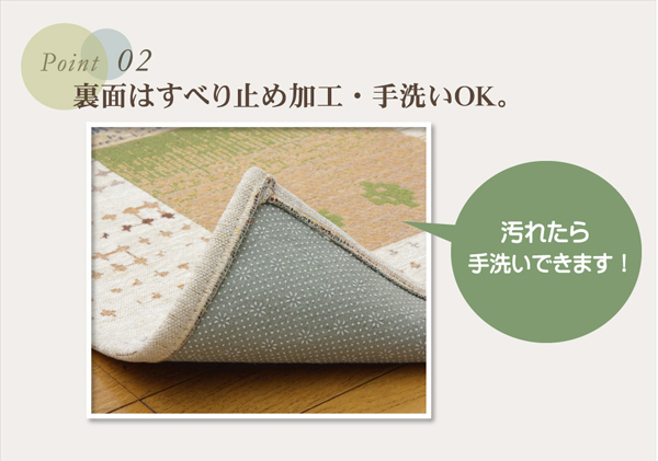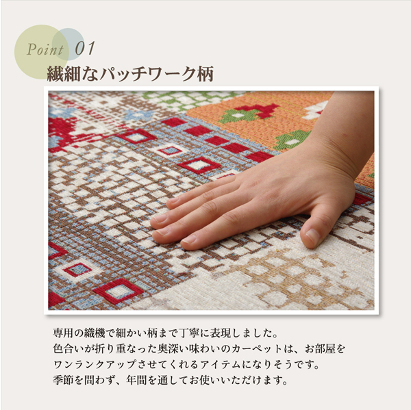 | ■柄、色合いにこだわったパッチワーク調のカーペットです。専用の織り機で丁寧に織り上げ細かい柄を表現しています。カラーは赤を基調としたかわいらしいレッドと落ち着いた色合いでベーシックな家具やソファーにも合わせやすいベージュの2色があります。折りたたむとコンパクトになり収納にも困りません。裏にはすべりにくい加工を施しています。汚れやすいカーペットにはうれしい、手洗い可能な商品です。 ■お洗濯は30℃以下の水温で弱い手洗いがよい。中性洗剤をご使用下さい。(洗濯機の使用はできません。) ■干し方=日陰のつり干しがよい。 ※写真は表記サイズと異なる場合がございます。 |