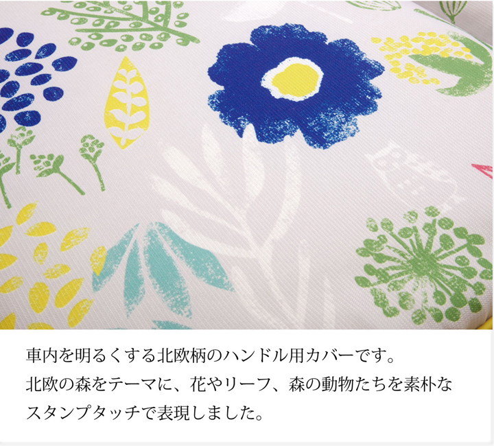 | ■北欧テイストを取り入れた車のハンドルカバーです。北欧の森をテーマに花やリーフ、森の動物たちを素朴で味のあるスタンプタッチで表現しました。